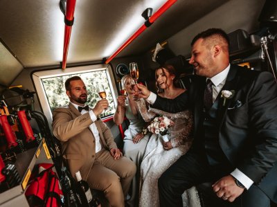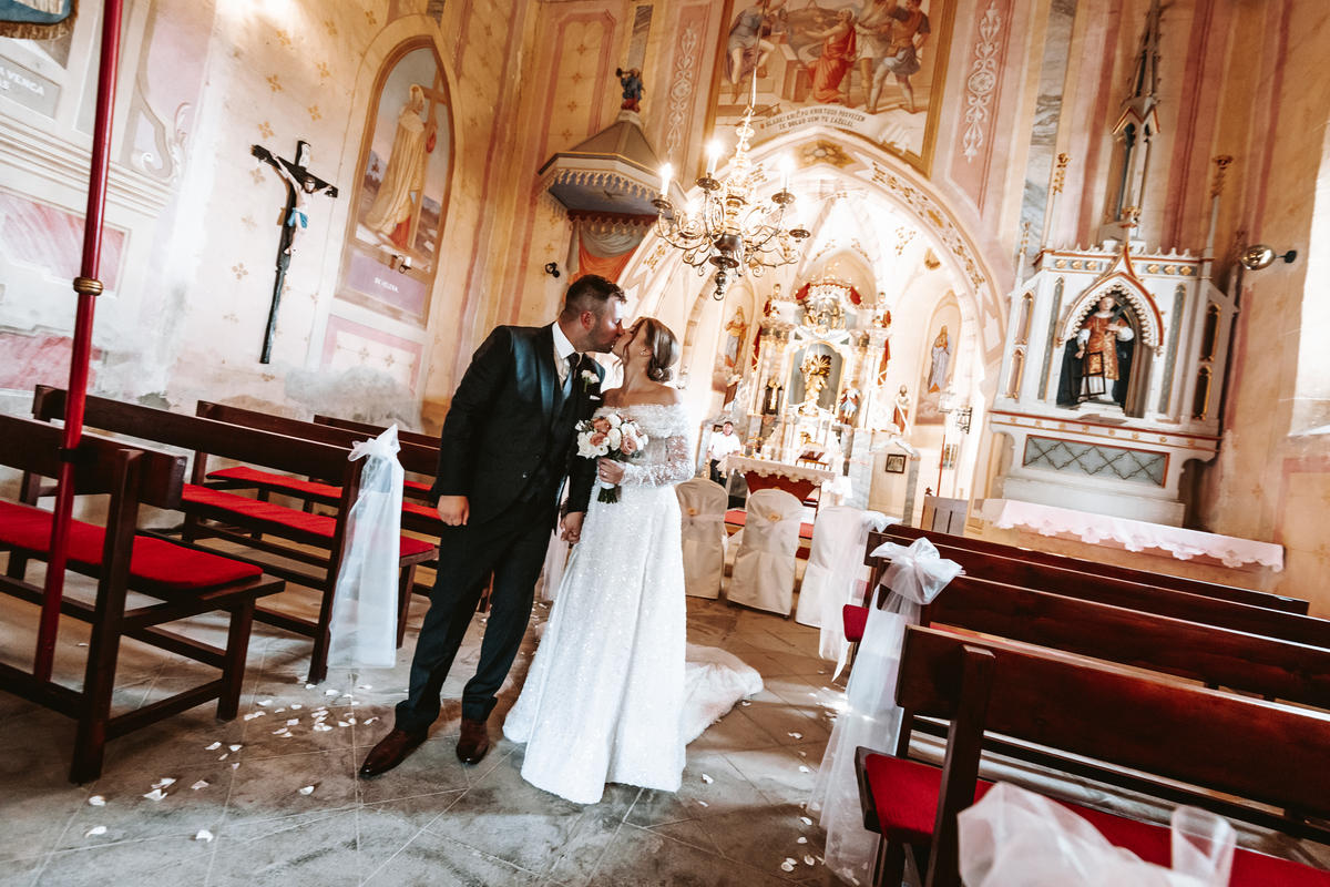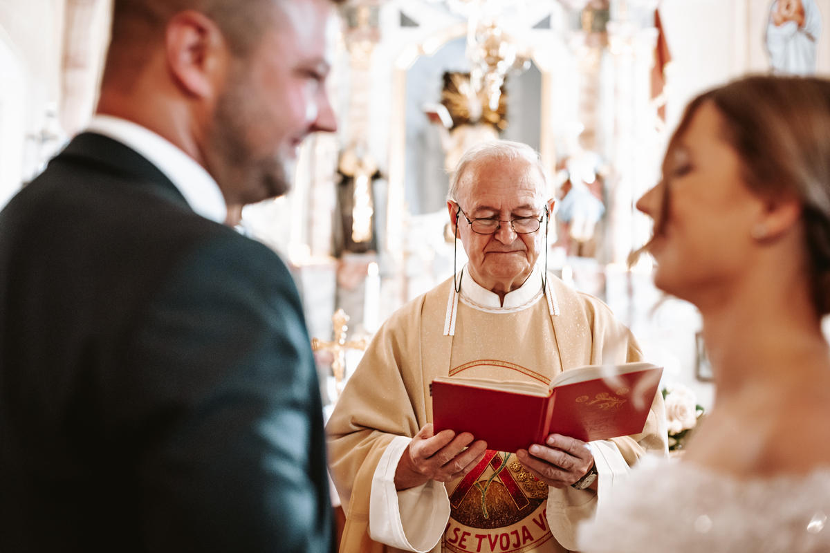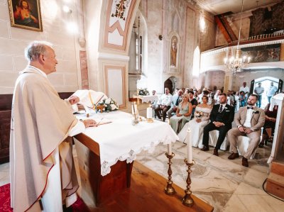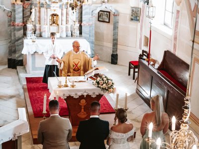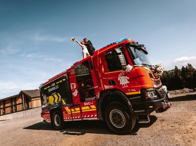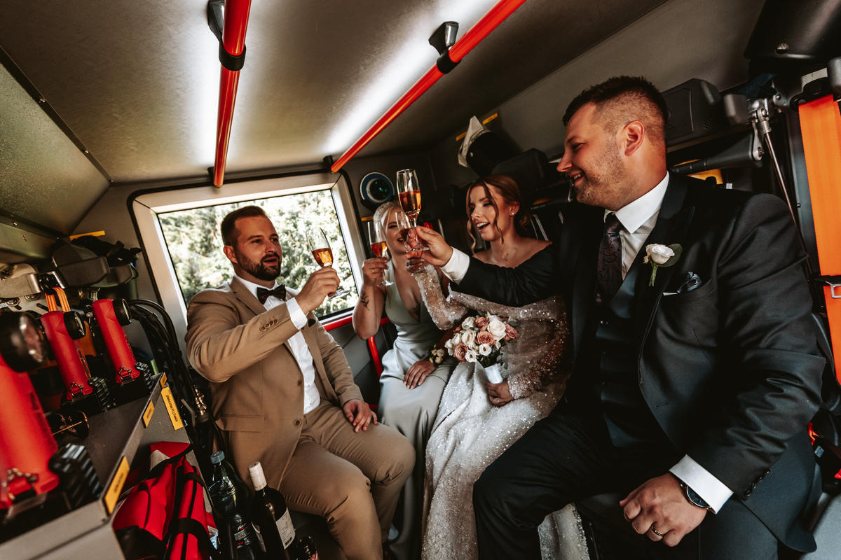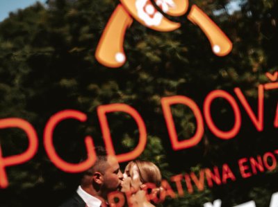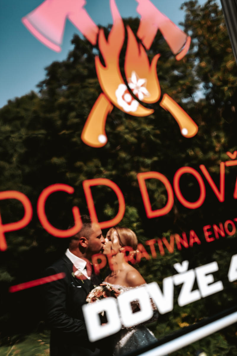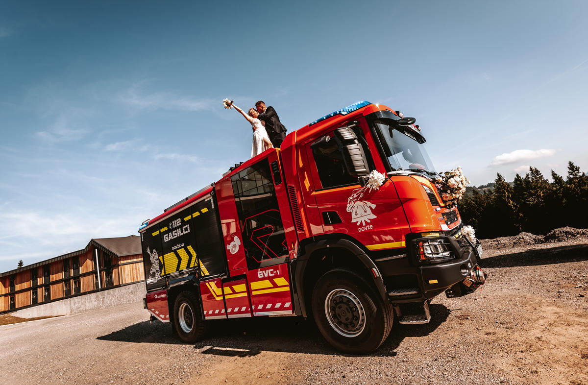 Čas priprav na poročni dan je hitro minil in že je bil tukaj dan D. Čudovit sobotni dan v že kar poznem poletju, ki se je že skoraj prevešalo v jesen. Priprave na poroko so potekale na domačiji v dolini, nakar smo se odpravili v cerkev sv. Andreja na Brdah kjer je župnik g. Linasi izvedel čudovit cerkveni poročni obred. Nato so jima kolegi gasilci pripravili slavolok z vodnimi topovi, na vrh planine pa smo se z družbo odpeljali v gasilskem tovornjaku. Omeniti moram, da je Jaka gasilski poveljnik PGD Dovže, zato smo za piko na "i" naredili še nekaj poročnih posnetkov na strehi gasilskega avta.