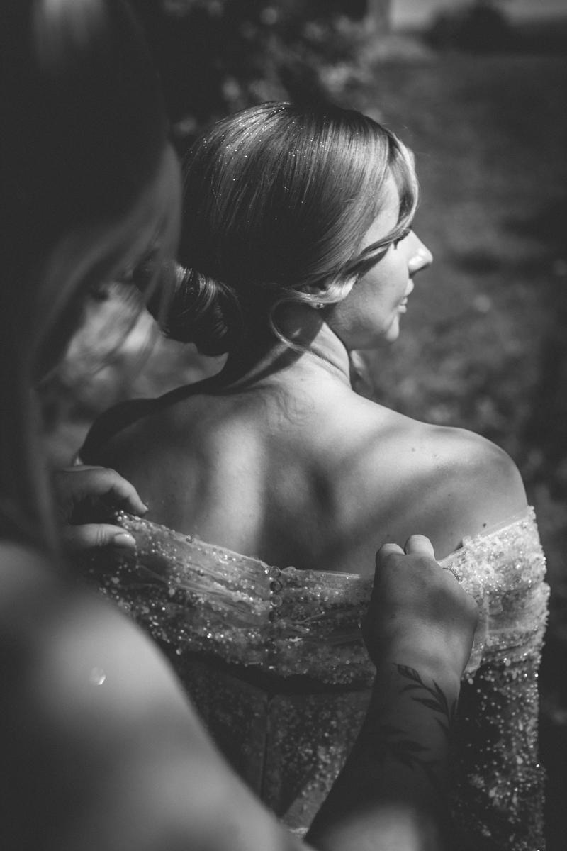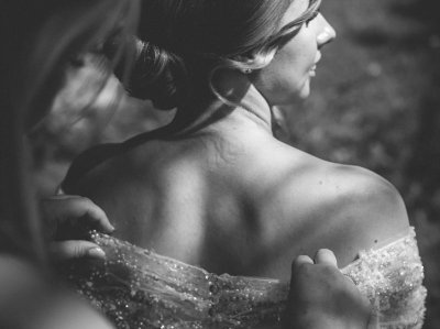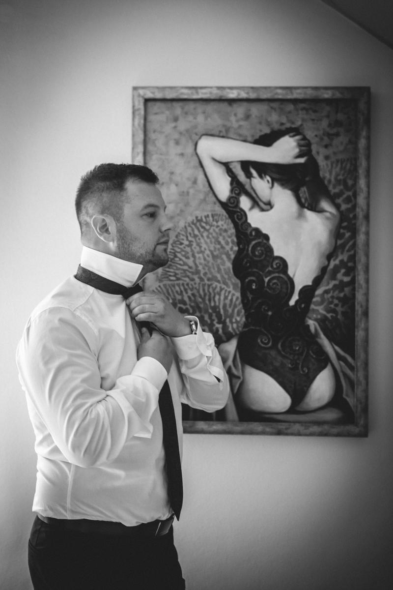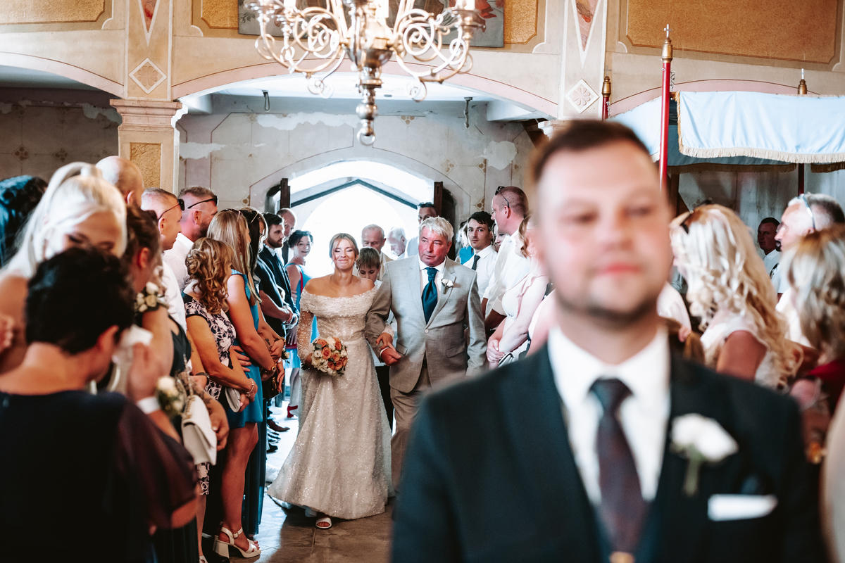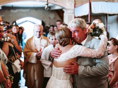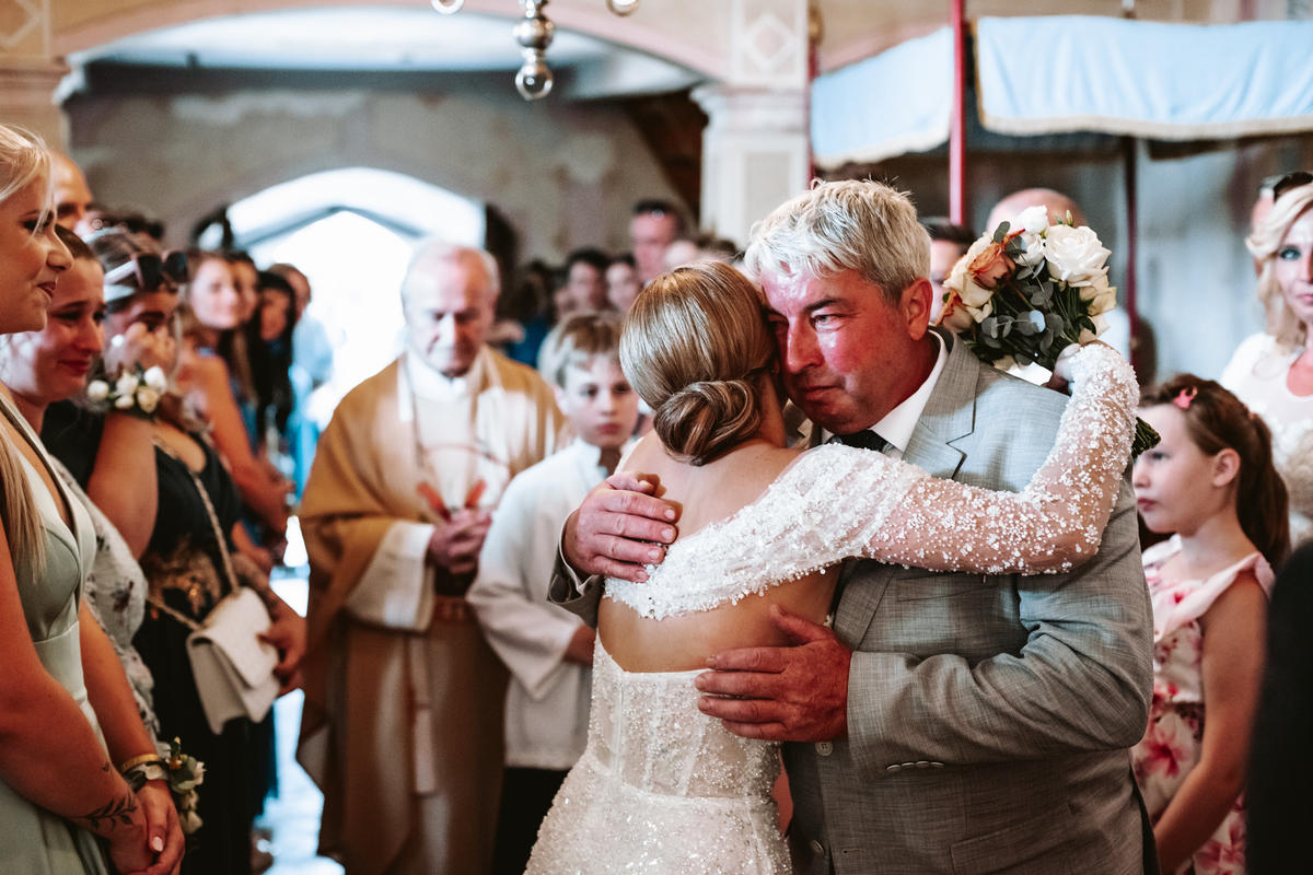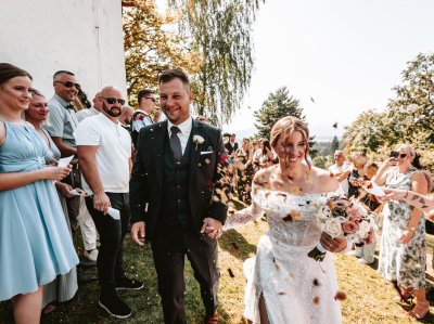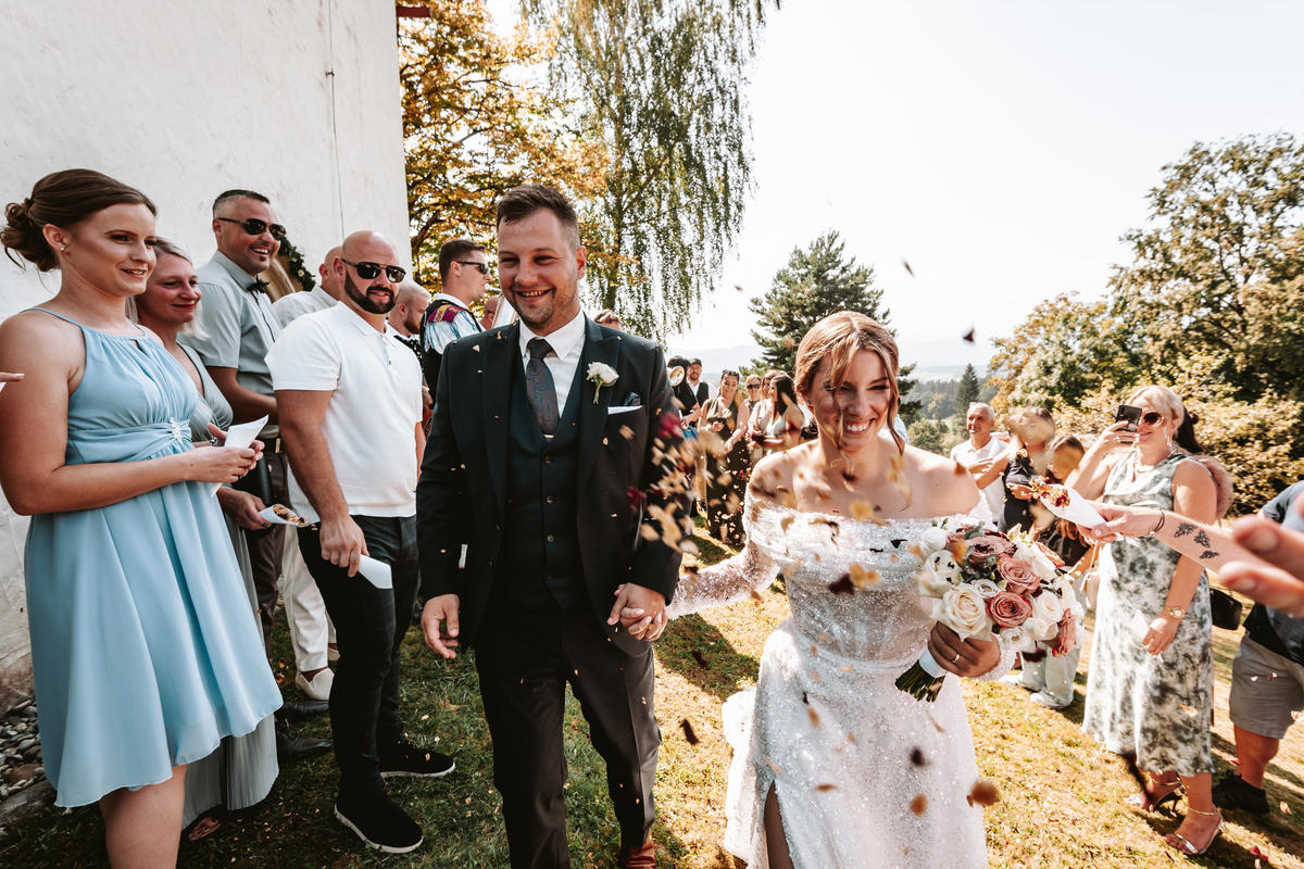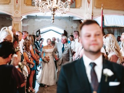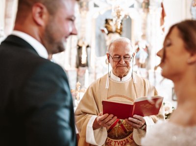 Čas priprav na poročni dan je hitro minil in že je bil tukaj dan D. Čudovit sobotni dan v že kar poznem poletju, ki se je že skoraj prevešalo v jesen. Priprave na poroko so potekale na domačiji v dolini, nakar smo se odpravili v cerkev sv. Andreja na Brdah kjer je župnik g. Linasi izvedel čudovit cerkveni poročni obred. Nato so jima kolegi gasilci pripravili slavolok z vodnimi topovi, na vrh planine pa smo se z družbo odpeljali v gasilskem tovornjaku. Omeniti moram, da je Jaka gasilski poveljnik PGD Dovže, zato smo za piko na "i" naredili še nekaj poročnih posnetkov na strehi gasilskega avta.