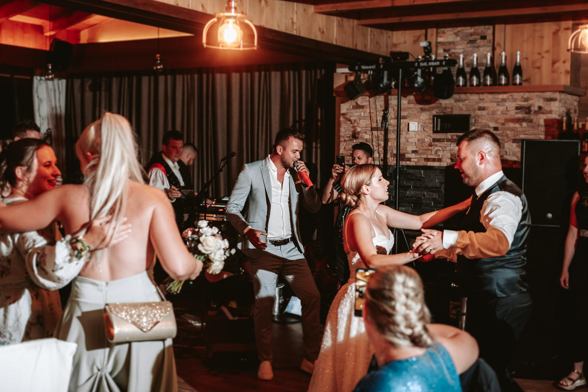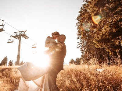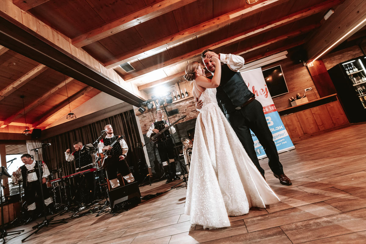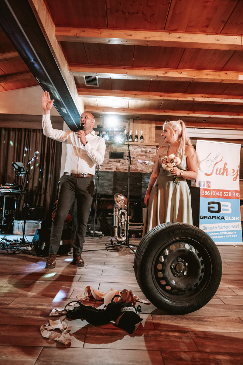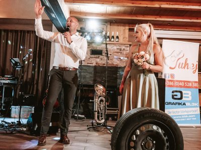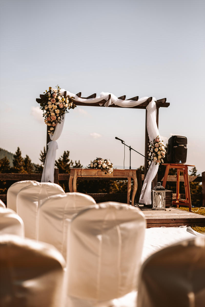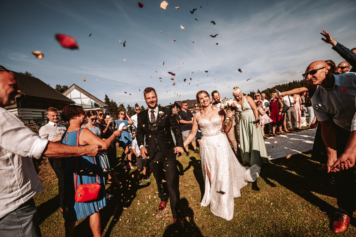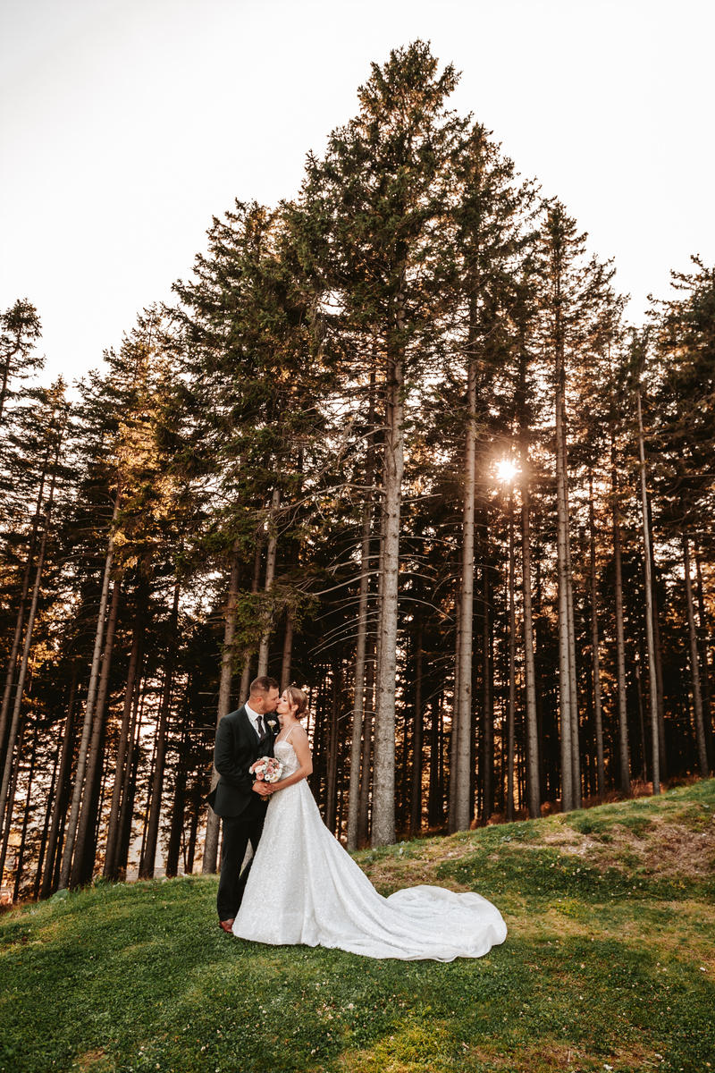 Na Kopah je sledil civilni poročni obred, ki ga je s svojim petjem še polepšala mlada pevka Iza. Uradni del je potekal kje drugje kot na prostem, s čudovitim razgledom na planino in vrhove smrek. Fotografiranje para smo izvedli na planini, ob jezeru in na vrhu Pungarta, medtem ko smo večer z razrezom torte zaključili ob čarobni sceni na terasi v družbi zvezdnatega neba in iskric. Ob zvokih ansambla Juhej in posebnem nastopu Luke Basija je poroka potekala v iskrivem razpoloženju – polna smeha, topline in veselja.
