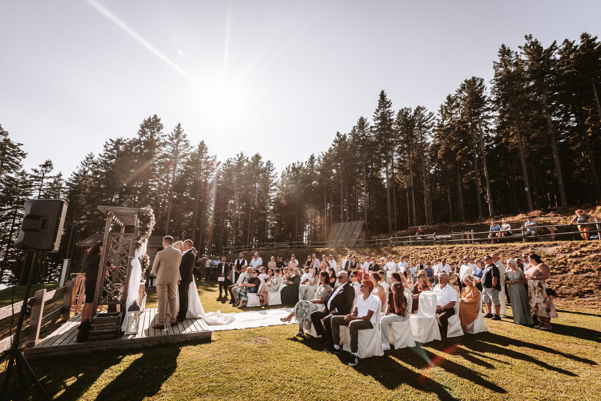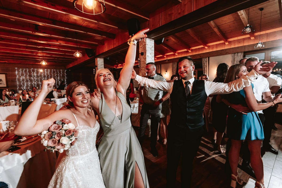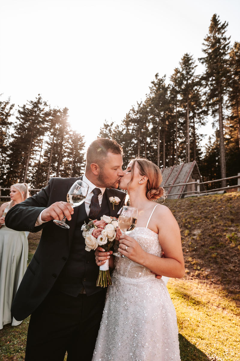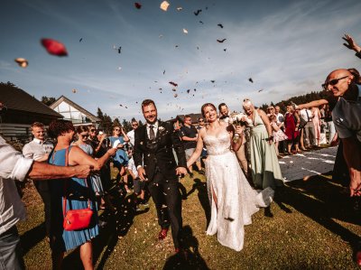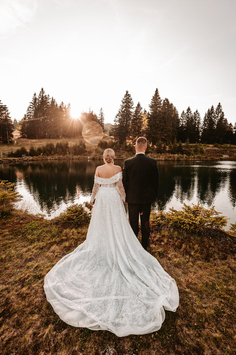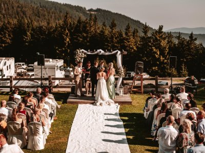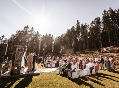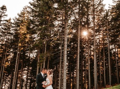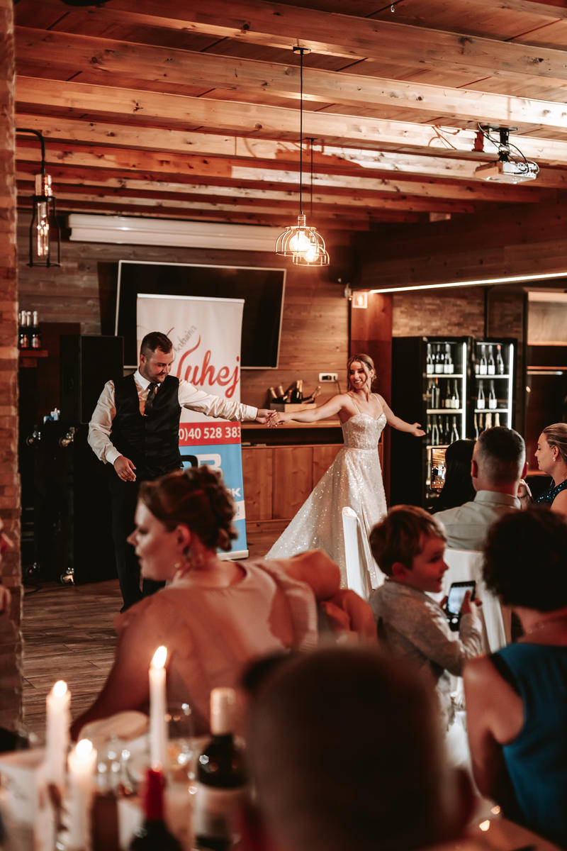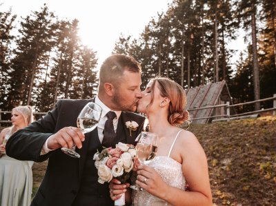 Na Kopah je sledil civilni poročni obred, ki ga je s svojim petjem še polepšala mlada pevka Iza. Uradni del je potekal kje drugje kot na prostem, s čudovitim razgledom na planino in vrhove smrek. Fotografiranje para smo izvedli na planini, ob jezeru in na vrhu Pungarta, medtem ko smo večer z razrezom torte zaključili ob čarobni sceni na terasi v družbi zvezdnatega neba in iskric. Ob zvokih ansambla Juhej in posebnem nastopu Luke Basija je poroka potekala v iskrivem razpoloženju – polna smeha, topline in veselja.