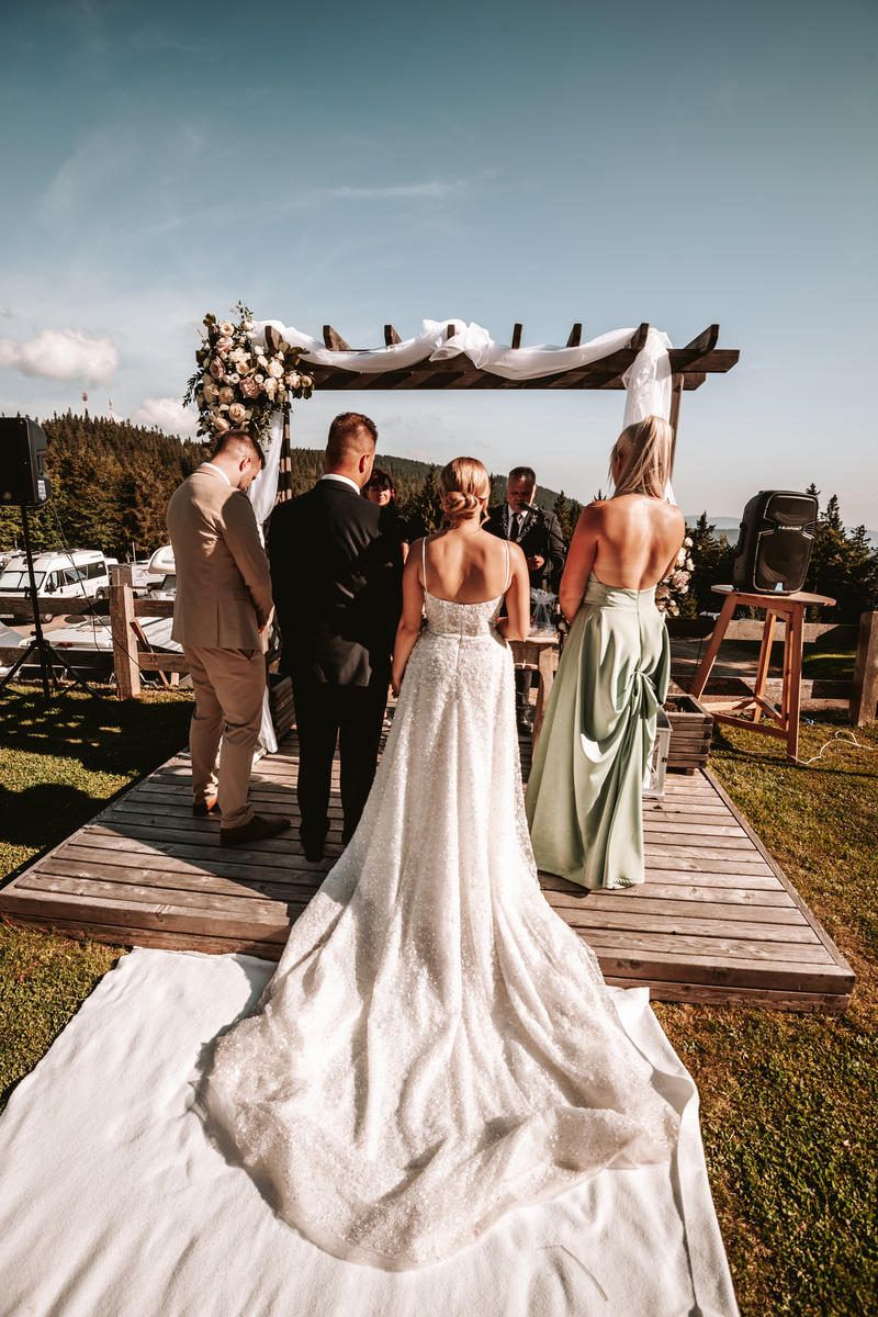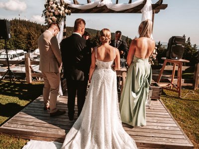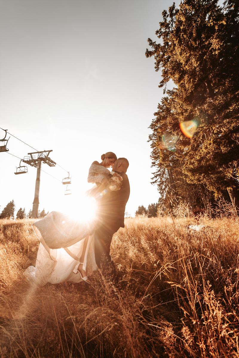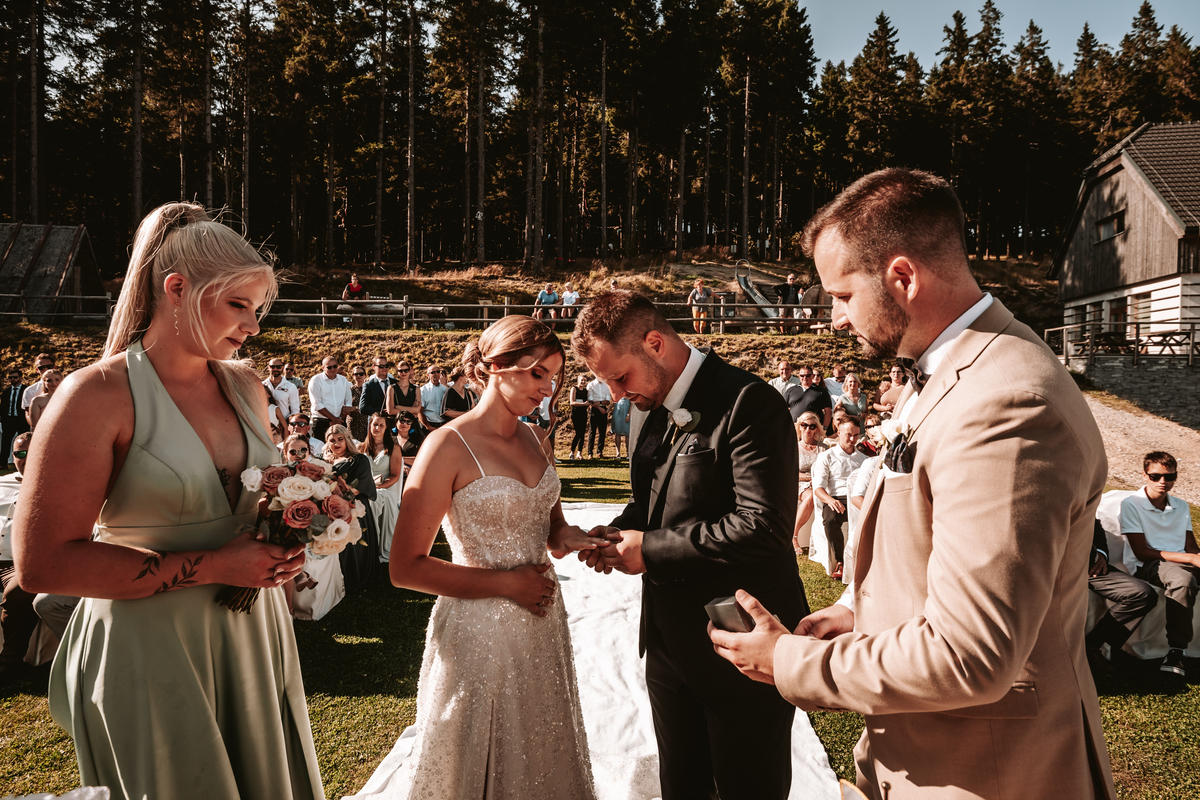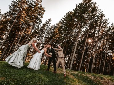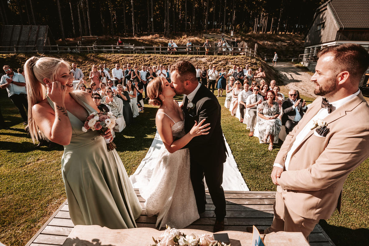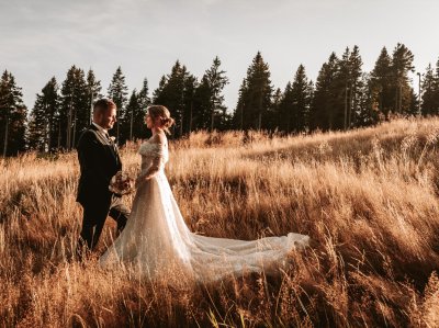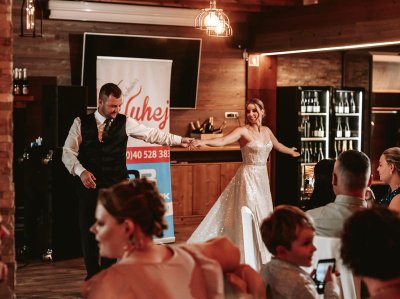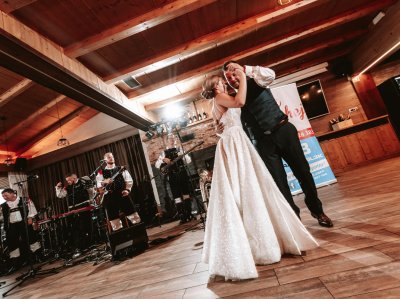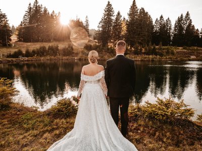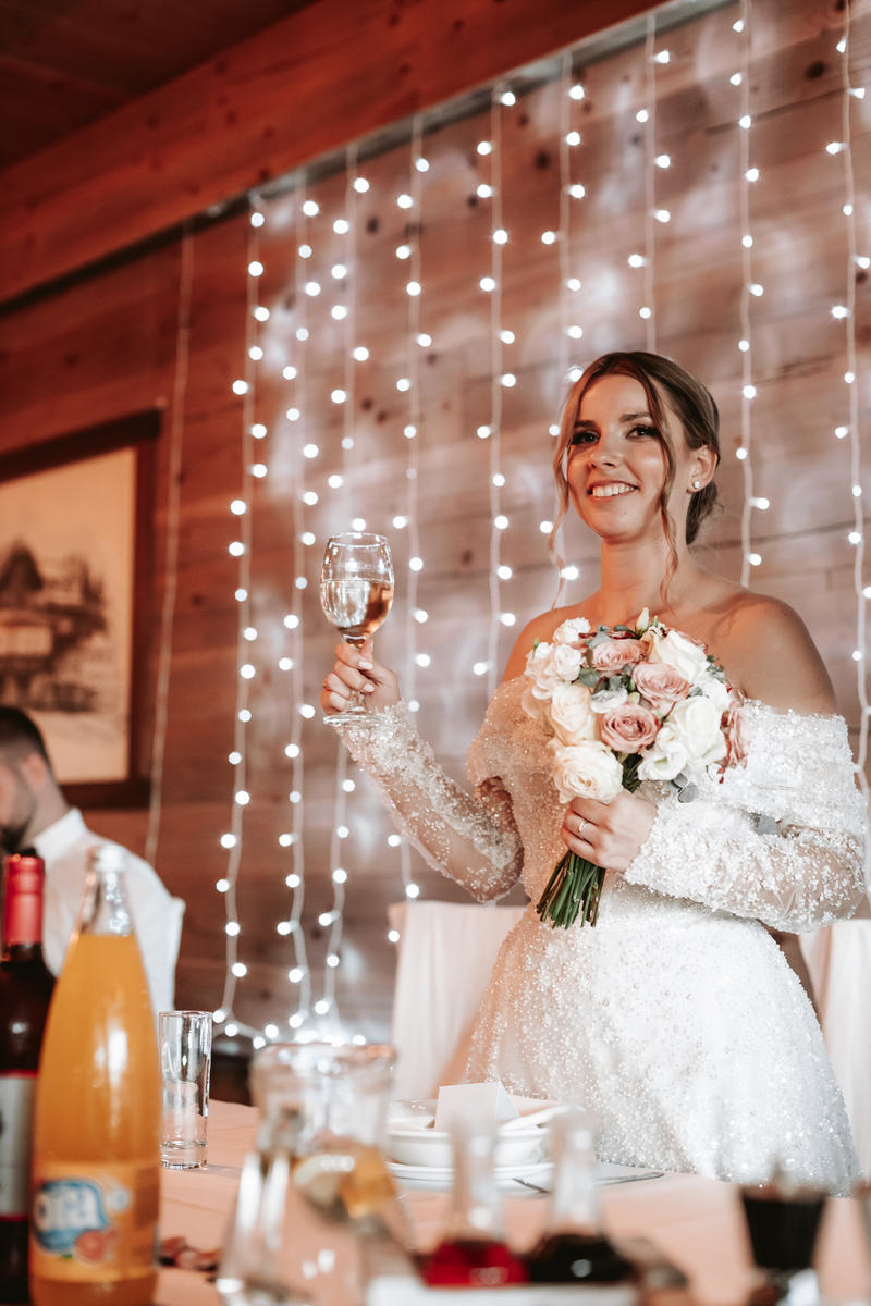 Na Kopah je sledil civilni poročni obred, ki ga je s svojim petjem še polepšala mlada pevka Iza. Uradni del je potekal kje drugje kot na prostem, s čudovitim razgledom na planino in vrhove smrek. Fotografiranje para smo izvedli na planini, ob jezeru in na vrhu Pungarta, medtem ko smo večer z razrezom torte zaključili ob čarobni sceni na terasi v družbi zvezdnatega neba in iskric. Ob zvokih ansambla Juhej in posebnem nastopu Luke Basija je poroka potekala v iskrivem razpoloženju – polna smeha, topline in veselja.