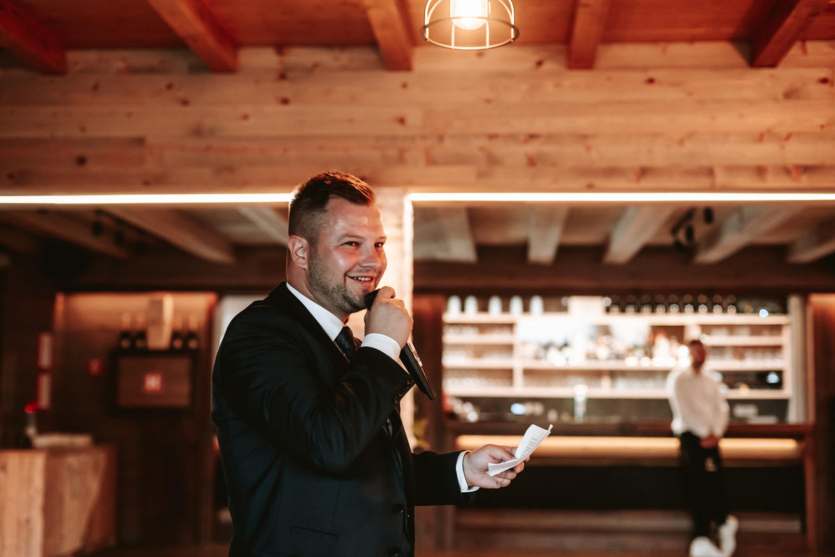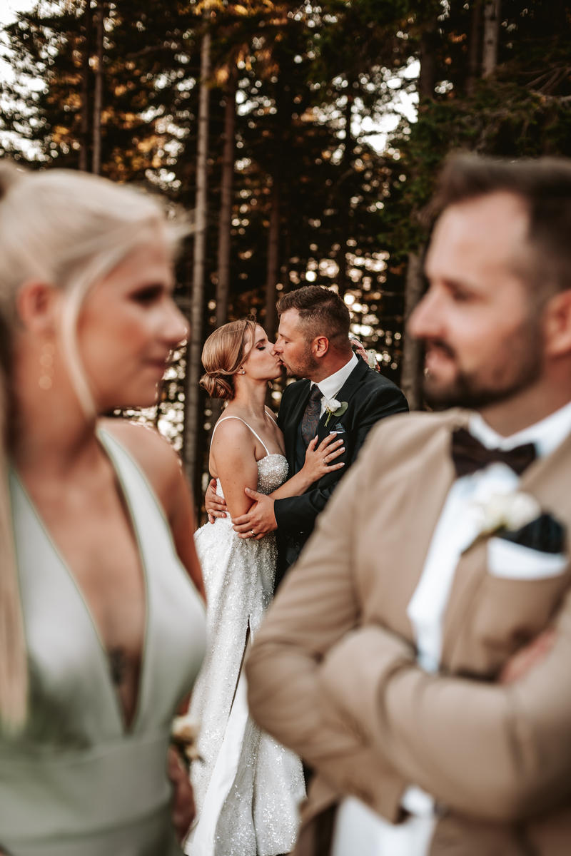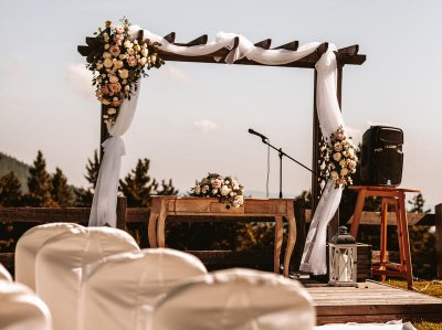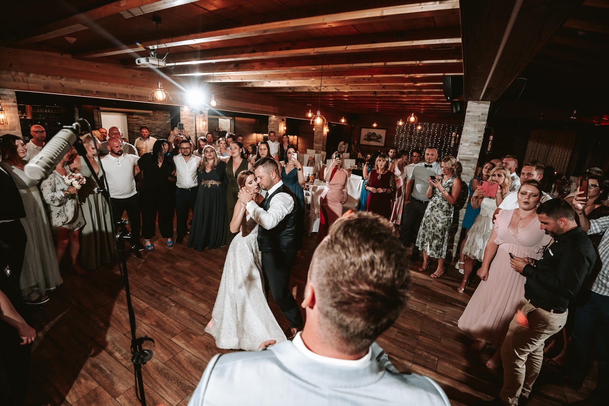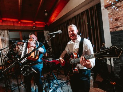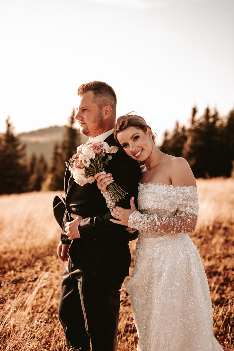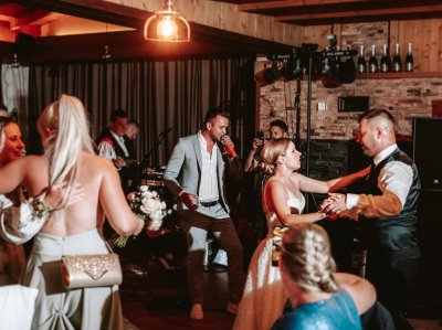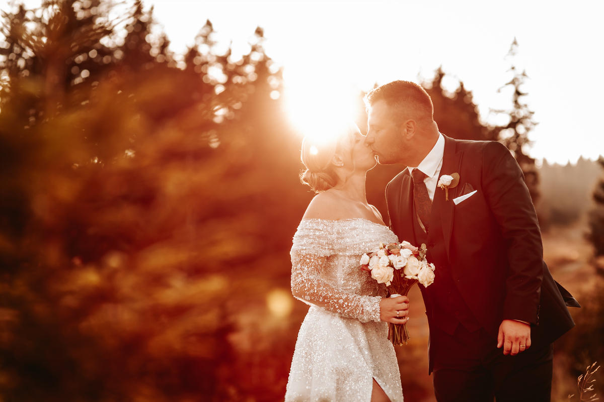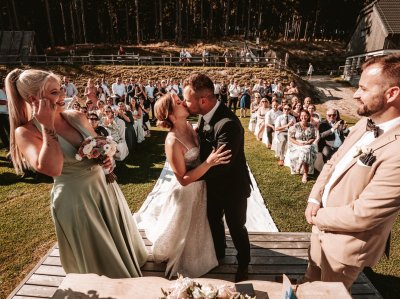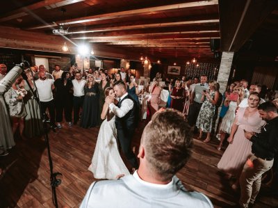 Na Kopah je sledil civilni poročni obred, ki ga je s svojim petjem še polepšala mlada pevka Iza. Uradni del je potekal kje drugje kot na prostem, s čudovitim razgledom na planino in vrhove smrek. Fotografiranje para smo izvedli na planini, ob jezeru in na vrhu Pungarta, medtem ko smo večer z razrezom torte zaključili ob čarobni sceni na terasi v družbi zvezdnatega neba in iskric. Ob zvokih ansambla Juhej in posebnem nastopu Luke Basija je poroka potekala v iskrivem razpoloženju – polna smeha, topline in veselja.