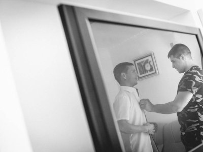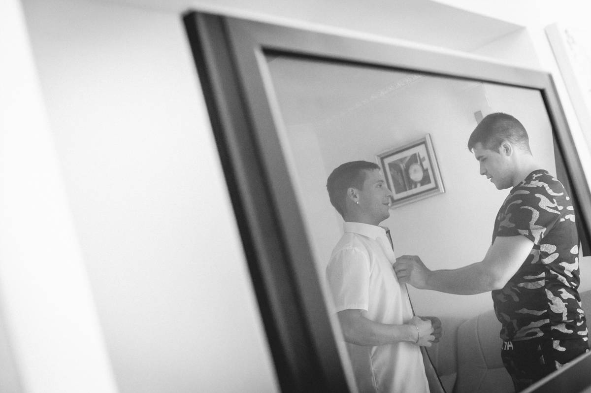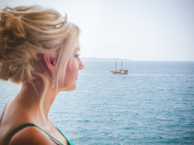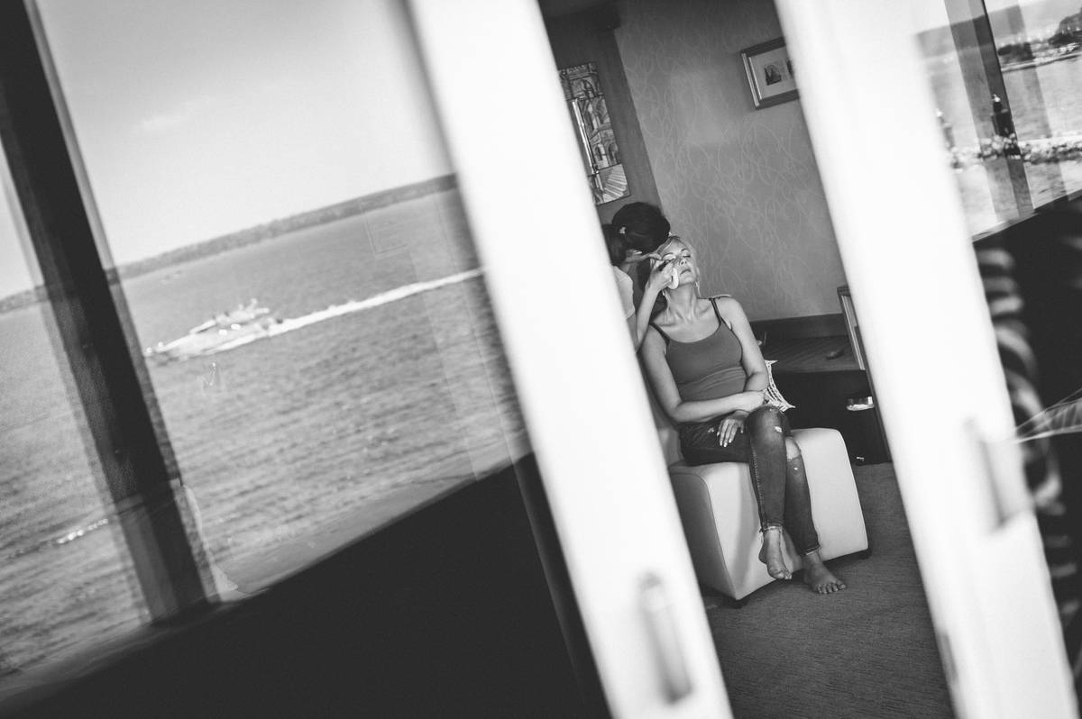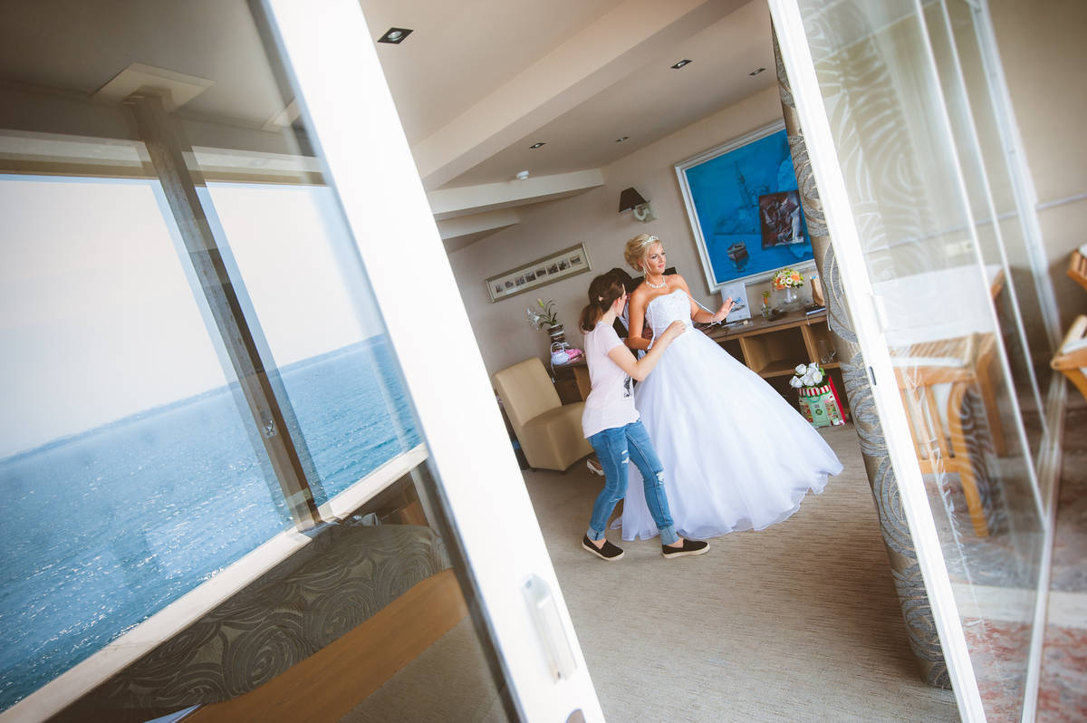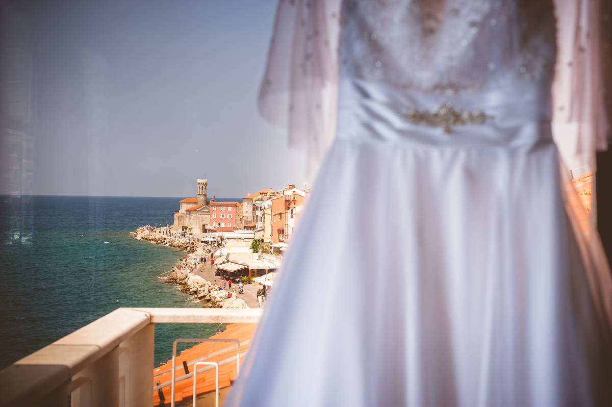 Dan se je začel v Hotelu Piran. Najvišje nad mestom, s pogledom na neskončno morje in modrina neba, ki ti kar vzame dih. V sobi polni smeha in pričakovanj je Mojca s čudovitim make-upom poudarila naravno lepoto neveste. Obleka iz poročnega salona Penelopa je nežno zablestela v svetlobi, ki je prihajala skozi odprta okna.