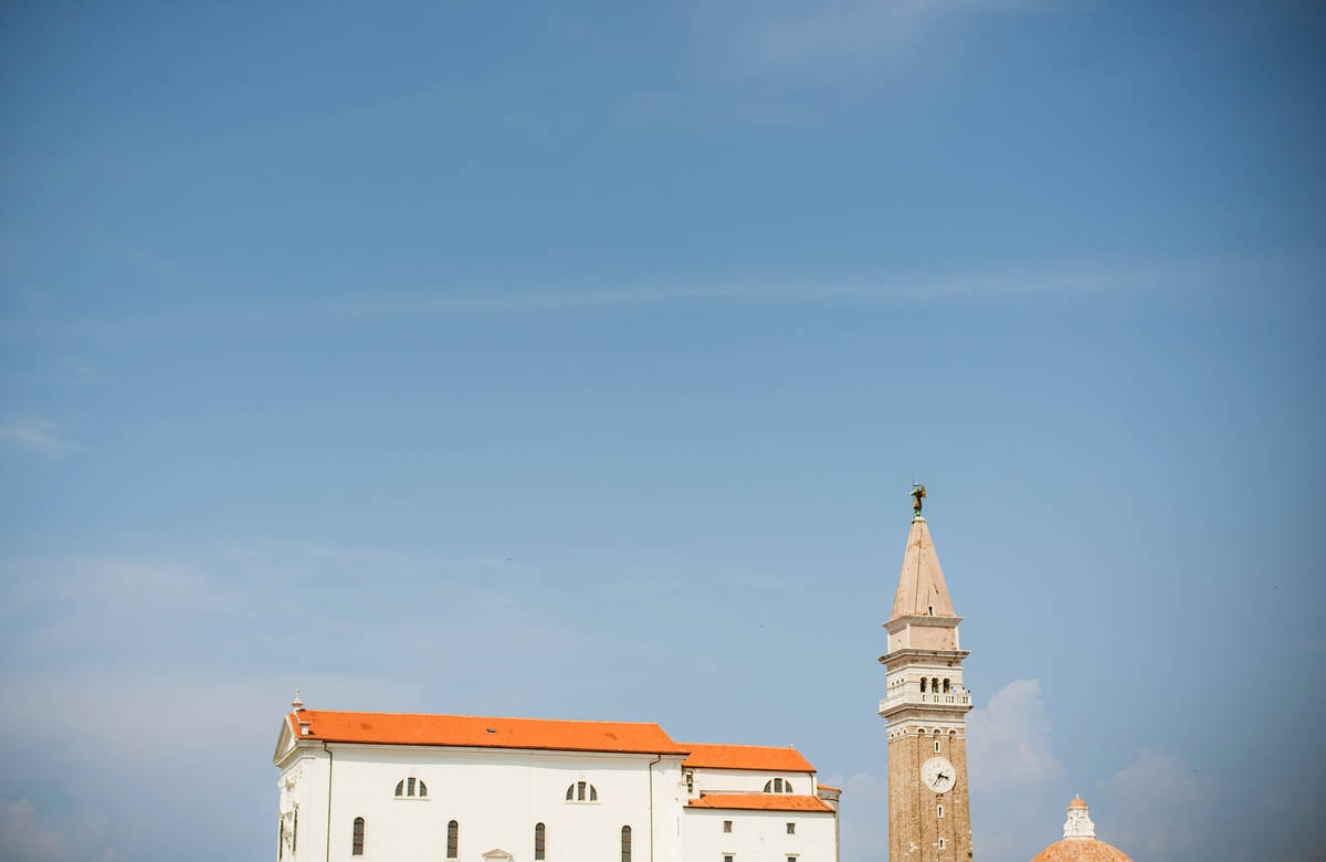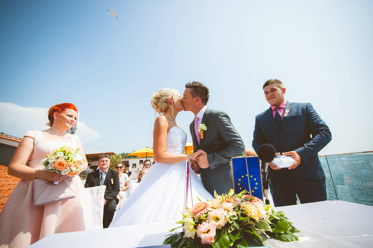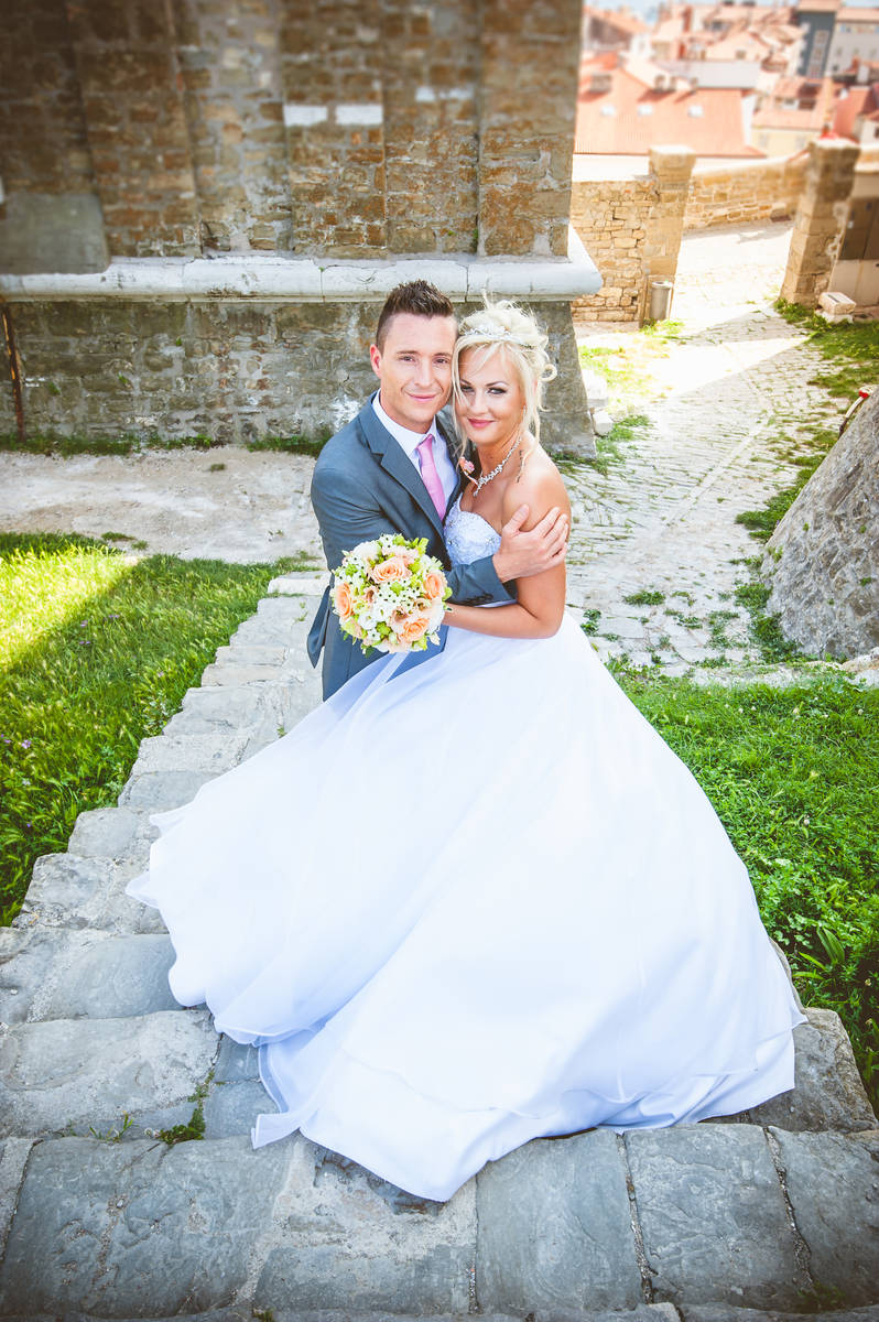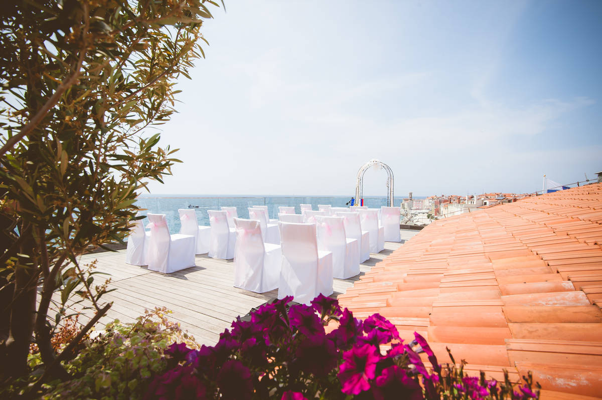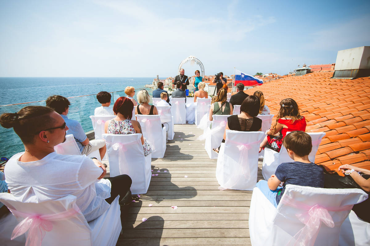 Obred je potekal na strehi hotela Piran. Galebi so letali nad nami, veter je nežno pihal in vonj po morju in soli je napolnil zrak. Tisti prizor, ko si dva izmenjata obljubo ob obali – brez odvečnega blišča, samo ljubezen, nebo in morje – vedno znova spomni, zakaj imam ta poklic tako rad. Po obredu smo se povzpeli še do Cerkve sv. Jurija kjer sta svojo zvestobo potrdila še pred Bogom. Pogled s cerkvenega obzidja visoko nad morjem pove vse - to mesto ima dušo.