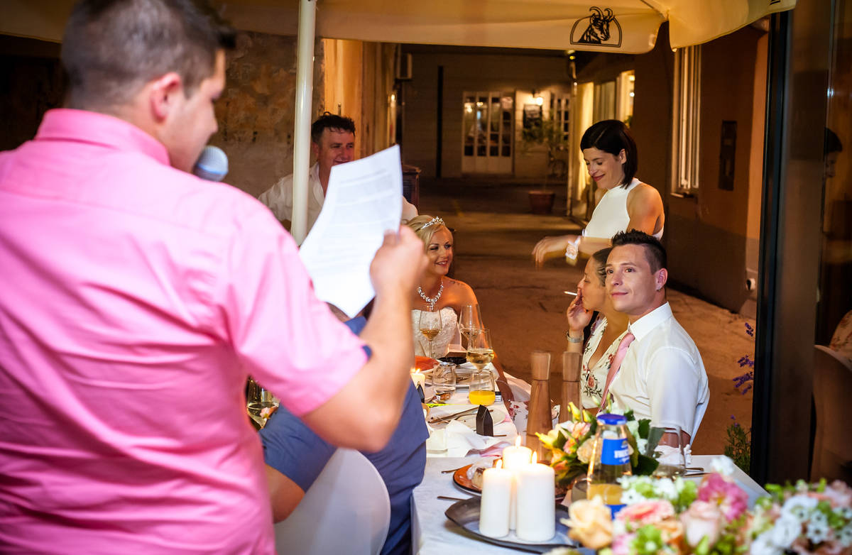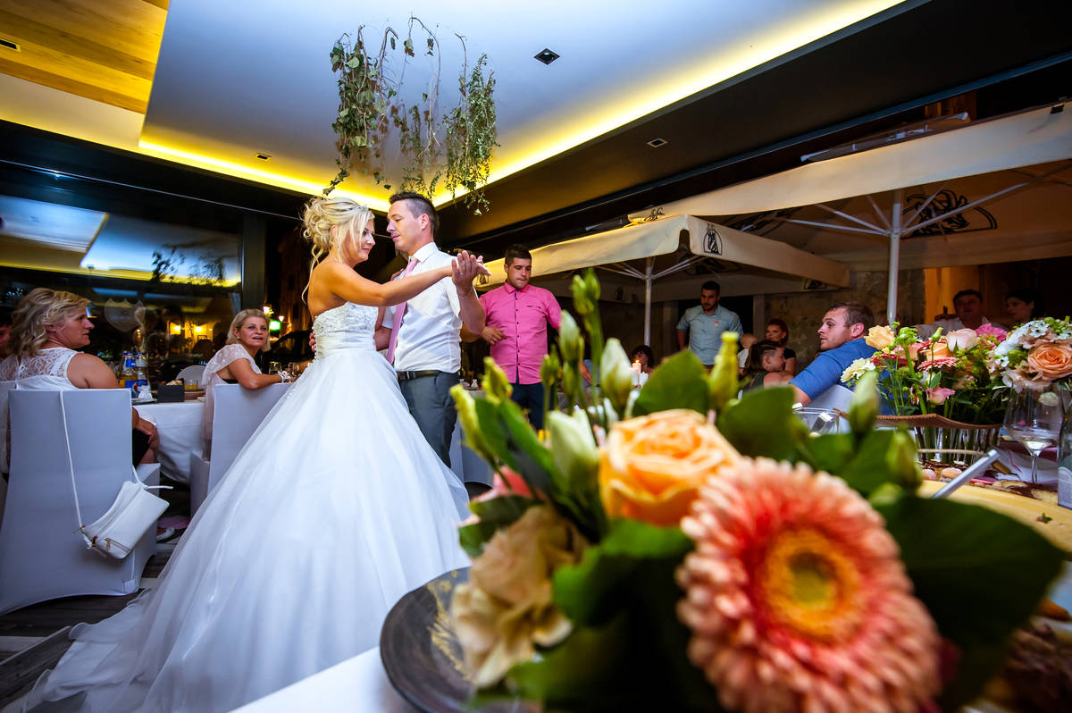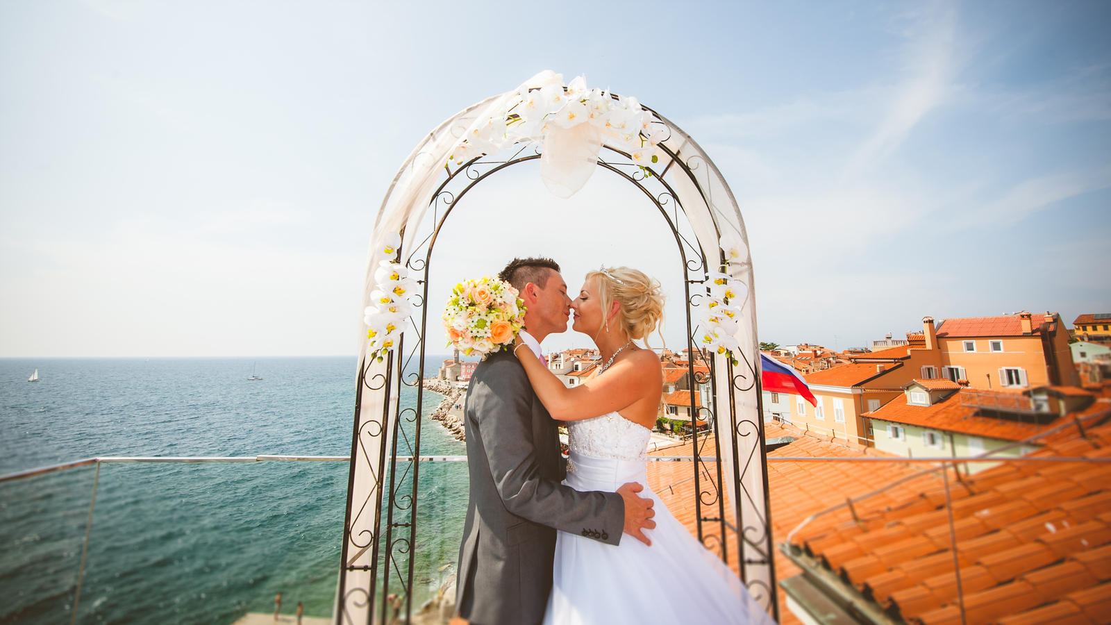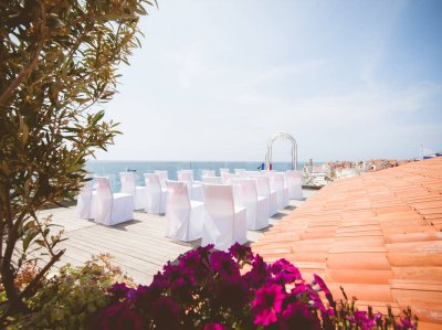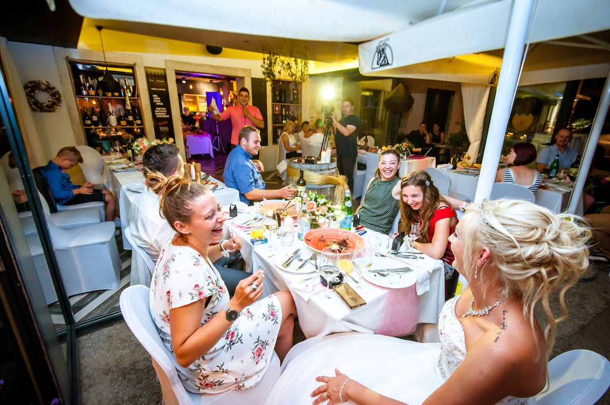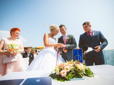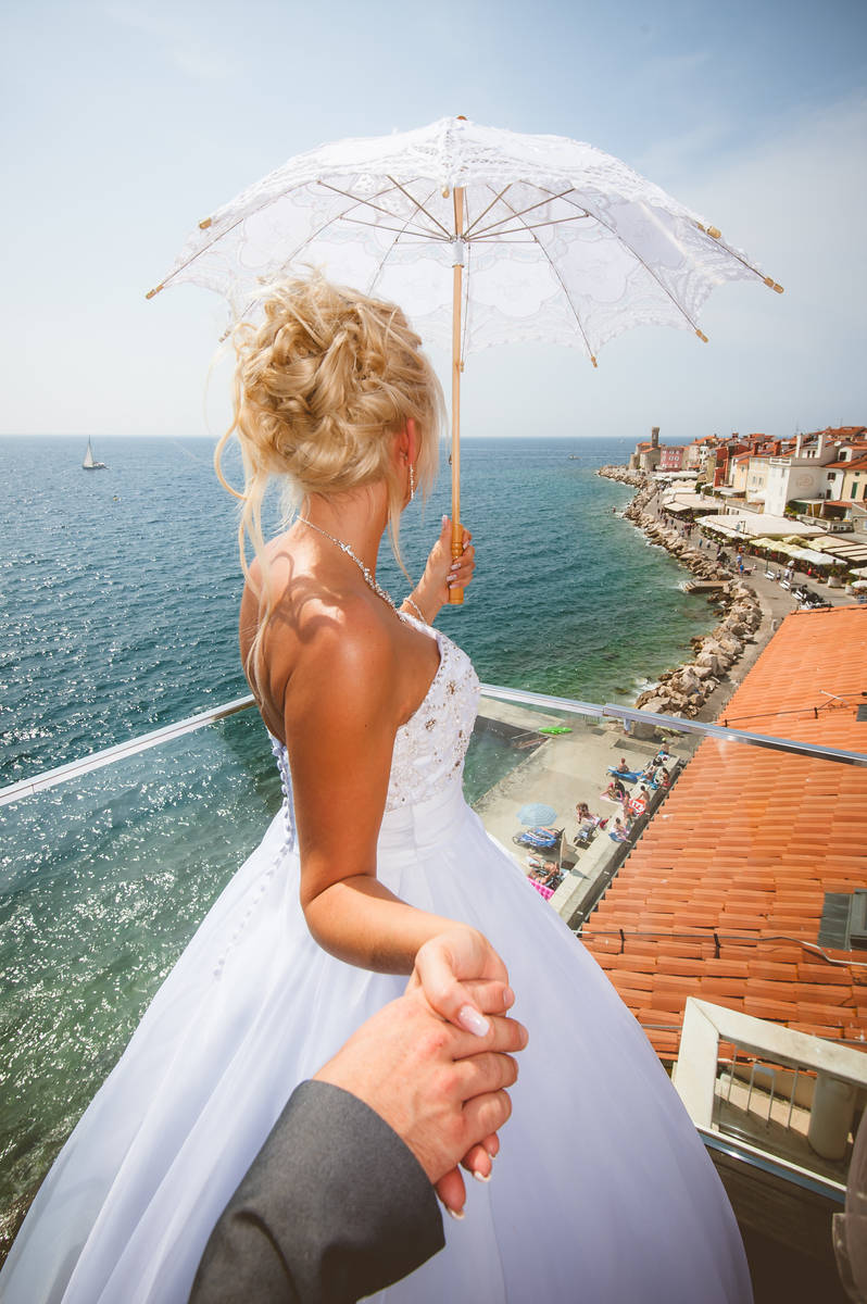 Obred je potekal na strehi hotela Piran. Galebi so letali nad nami, veter je nežno pihal in vonj po morju in soli je napolnil zrak. Tisti prizor, ko si dva izmenjata obljubo ob obali – brez odvečnega blišča, samo ljubezen, nebo in morje – vedno znova spomni, zakaj imam ta poklic tako rad. Po obredu smo se povzpeli še do Cerkve sv. Jurija kjer sta svojo zvestobo potrdila še pred Bogom. Pogled s cerkvenega obzidja visoko nad morjem pove vse - to mesto ima dušo.