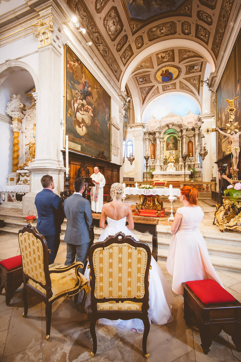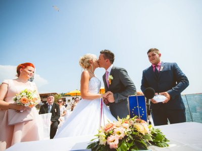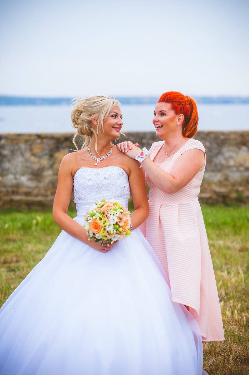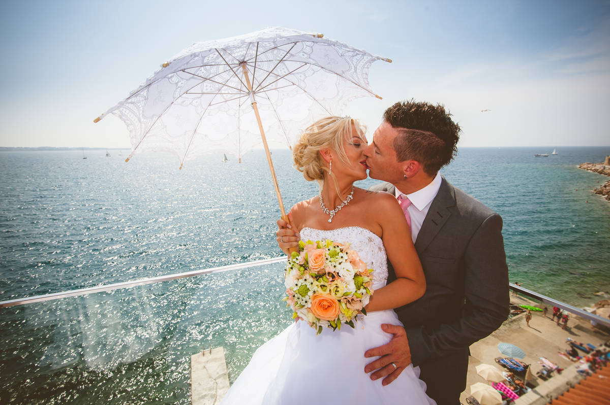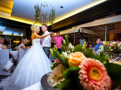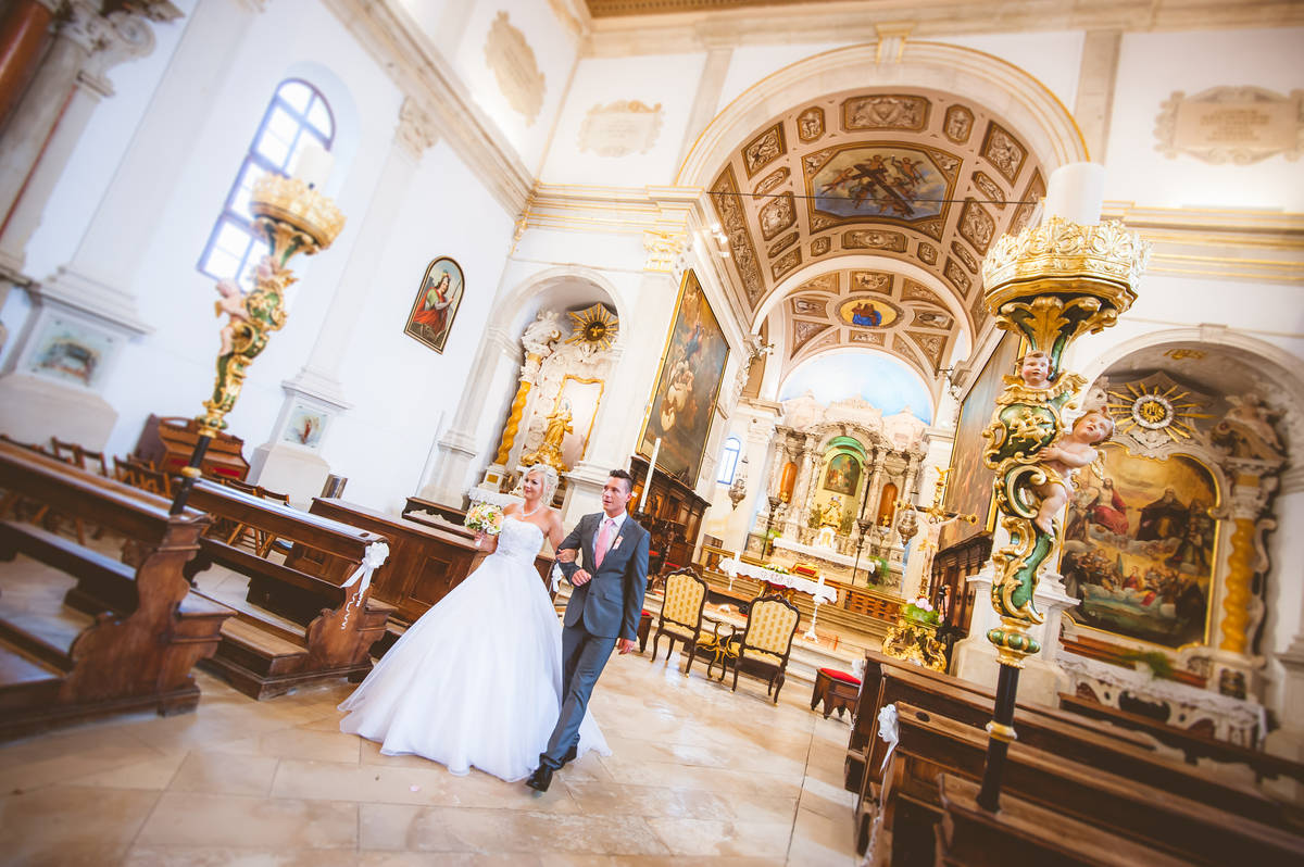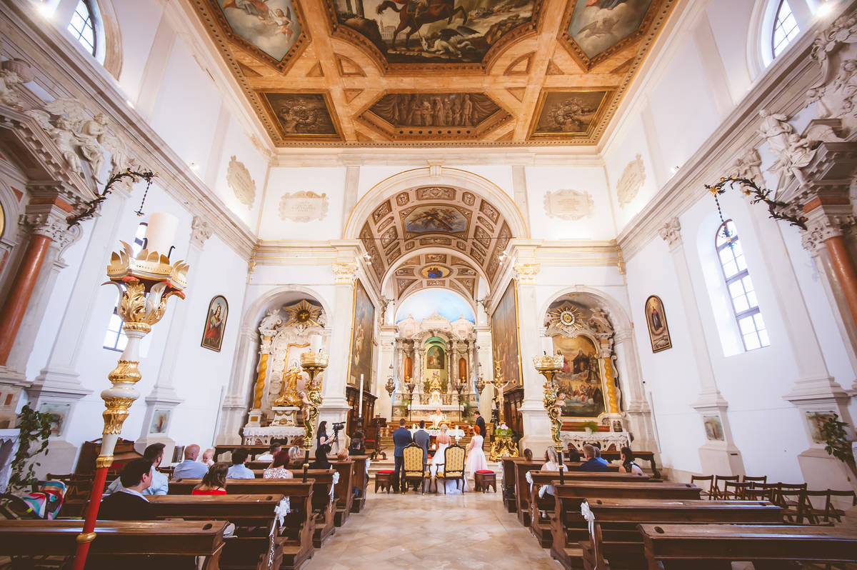 Obred je potekal na strehi hotela Piran. Galebi so letali nad nami, veter je nežno pihal in vonj po morju in soli je napolnil zrak. Tisti prizor, ko si dva izmenjata obljubo ob obali – brez odvečnega blišča, samo ljubezen, nebo in morje – vedno znova spomni, zakaj imam ta poklic tako rad. Po obredu smo se povzpeli še do Cerkve sv. Jurija kjer sta svojo zvestobo potrdila še pred Bogom. Pogled s cerkvenega obzidja visoko nad morjem pove vse - to mesto ima dušo.