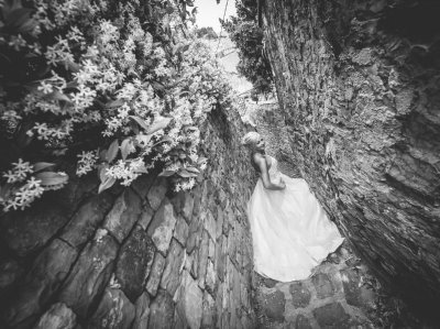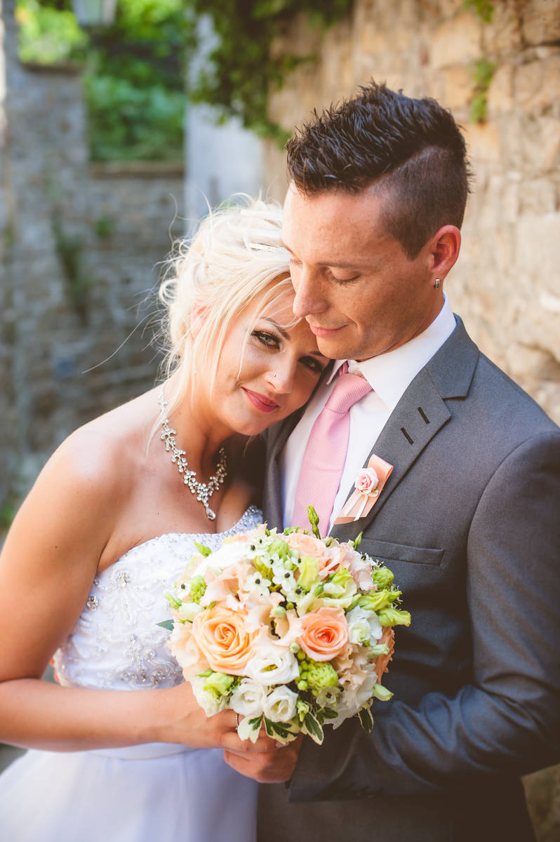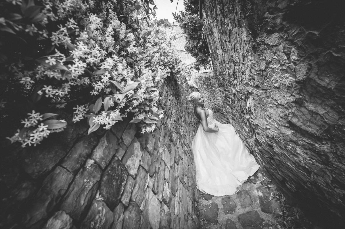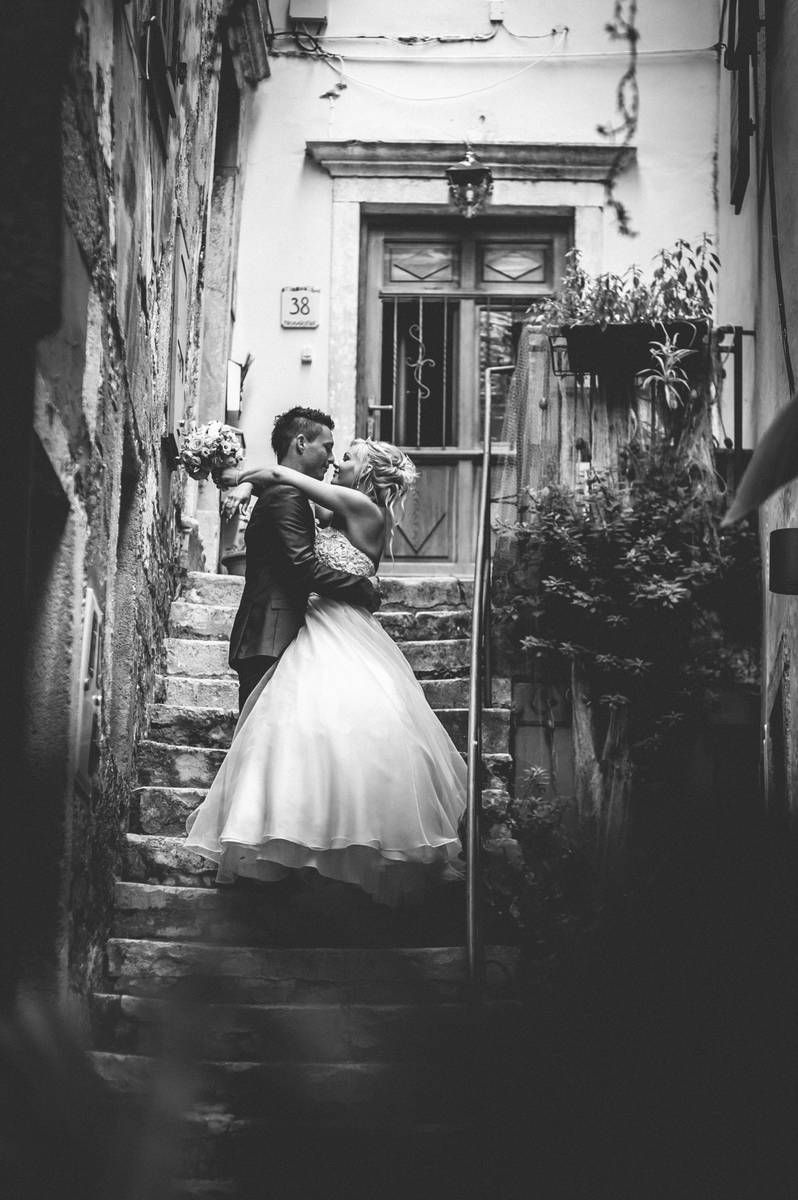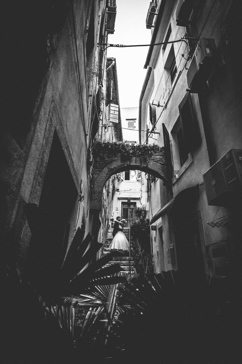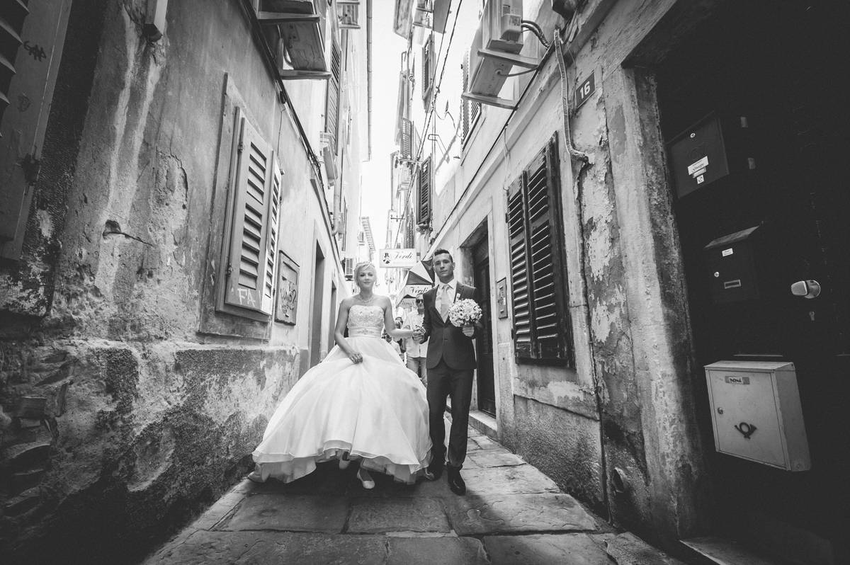 Potem pa tisti del, ki ga imam najraje – sprehod po mestnih uličicah. Tam, kjer vsak zid pripoveduje svojo zgodbo. Lovili smo drobne trenutke – nasmehe, dotike in poglede. Vse tiste male stvari, ki skupaj ustvarijo pravo poročno zgodbo. Proti večeru je sonce obarvalo mesto v zlato in Piran je postal čista poezija. Fotografiranje smo zaključili pri morju z romantično serijo fotografij ob spremljavi sončnega zahoda.