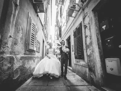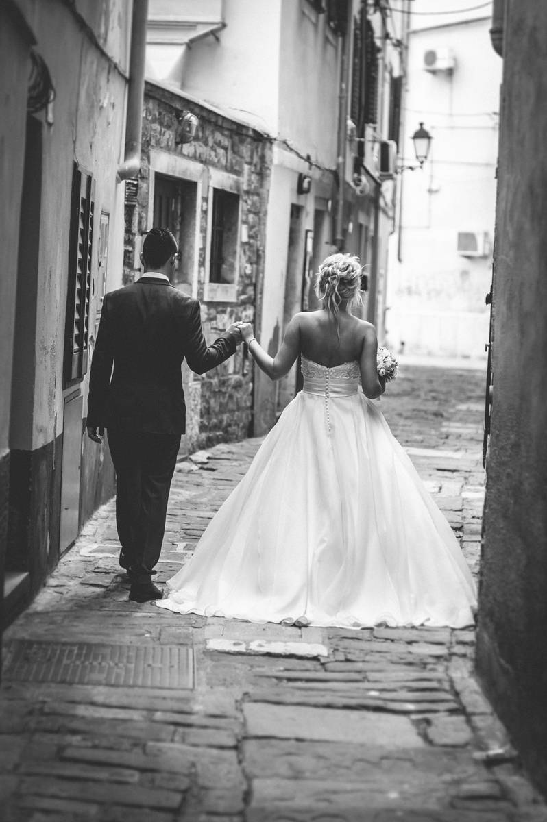 Ko me je Marinka poklicala in vprašala, ali bi fotografiral njuno poroko v Piranu, sem se v mislih že sprehajal po ozkih uličicah ob morju. Slišal sem valove, galebe in si predstavljal tiste rdeče barve sončnega zahoda, ki zna samo v Piranu tako lepo objeti človeka. Takrat sem vedel – to bo nekaj posebnega.